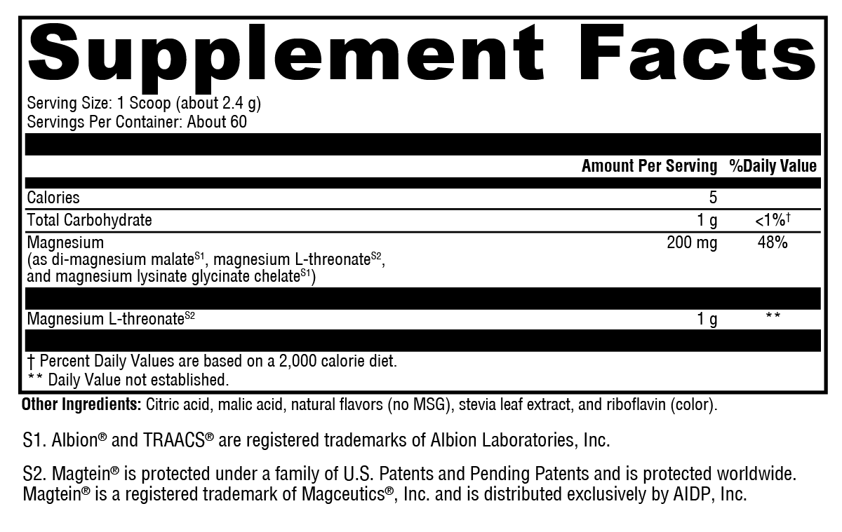 OptiMag® Neuro features Magtein® (magnesium L-threonate), the only magnesium that effectively crosses the protective barrier of the brain, the blood–brain barrier, and it is paired with premium, easily absorbed Albion® minerals. This potent combination ensures you maximize the benefits with every dose. Designed to support cognitive function and the nervous system, it also plays a vital role in managing stress and promoting rejuvenating sleep, along with being vital for more than 300 metabolic processes in the body to which magnesium also contributes. Elevate your brain’s magnesium levels, supercharge your cognitive abilities, and enhance your overall wellness with OptiMag Neuro.*