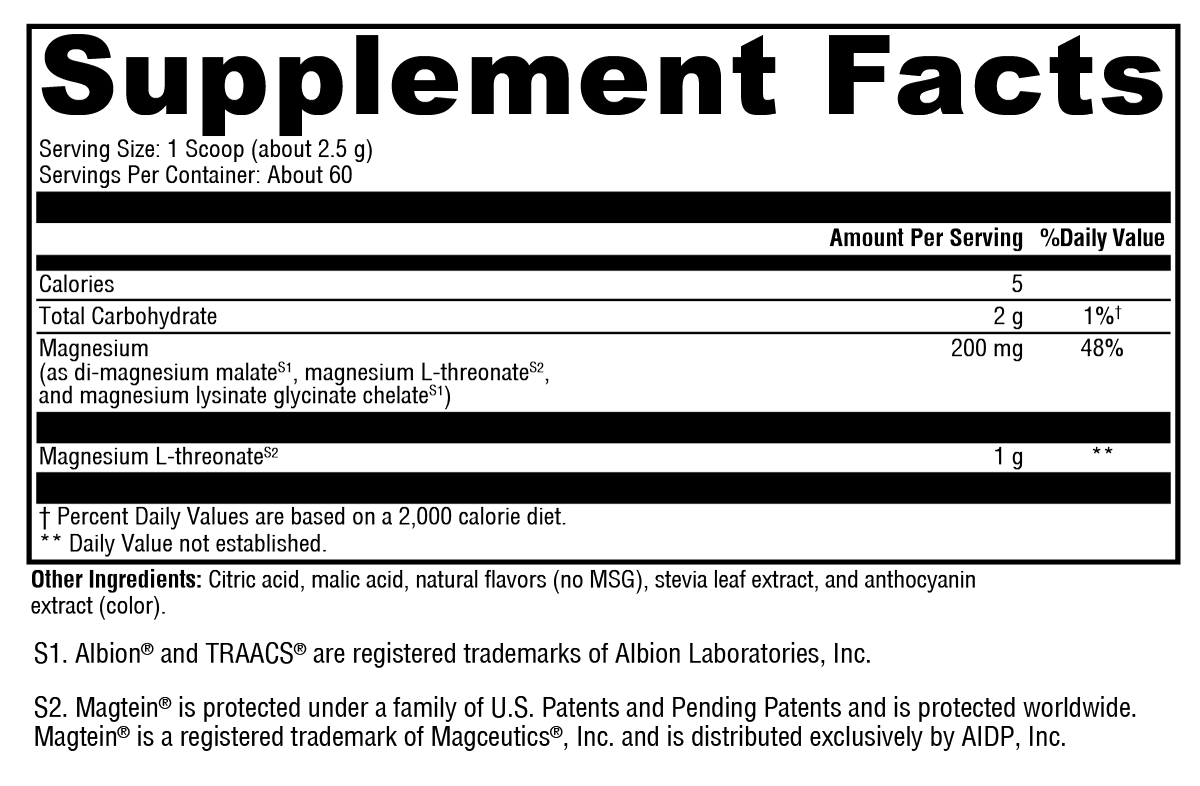 OptiMag® Neuro features Magtein® (magnesium L-threonate), the only magnesium that effectively crosses the protective barrier of the brain, the blood–brain barrier, and it is paired with premium, easily absorbed Albion® minerals. This potent combination ensures you maximize the benefits with every dose. Designed to support cognitive function and the nervous system, it also plays a vital role in managing stress and promoting rejuvenating sleep, along with being vital for more than 300 metabolic processes in the body to which magnesium also contributes. Elevate your brain’s magnesium levels, supercharge your cognitive abilities, and enhance your overall wellness with OptiMag Neuro.*